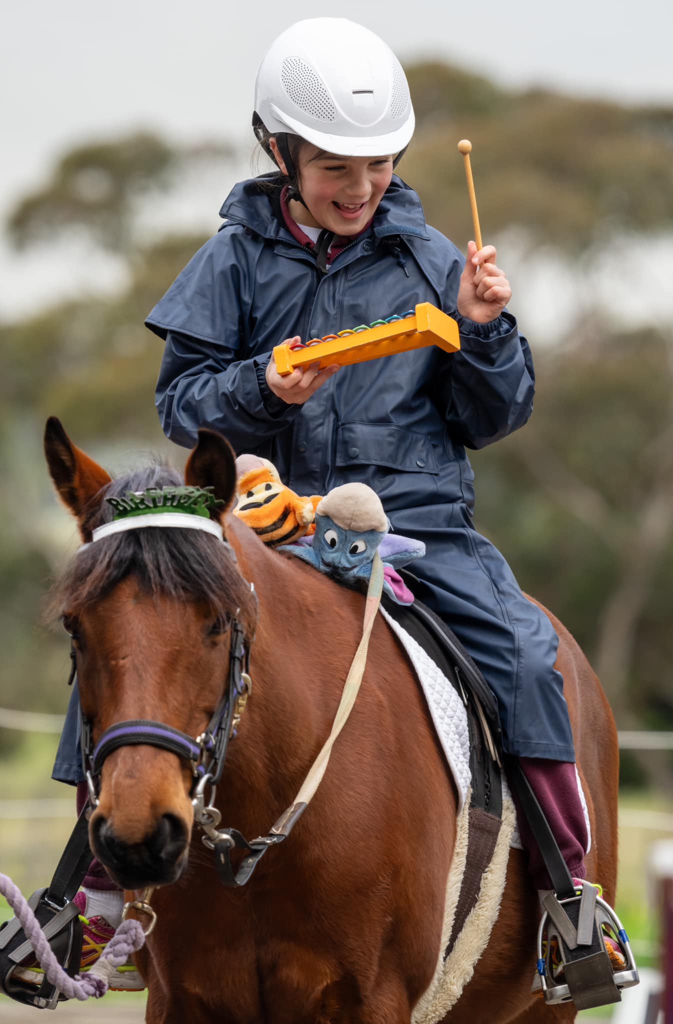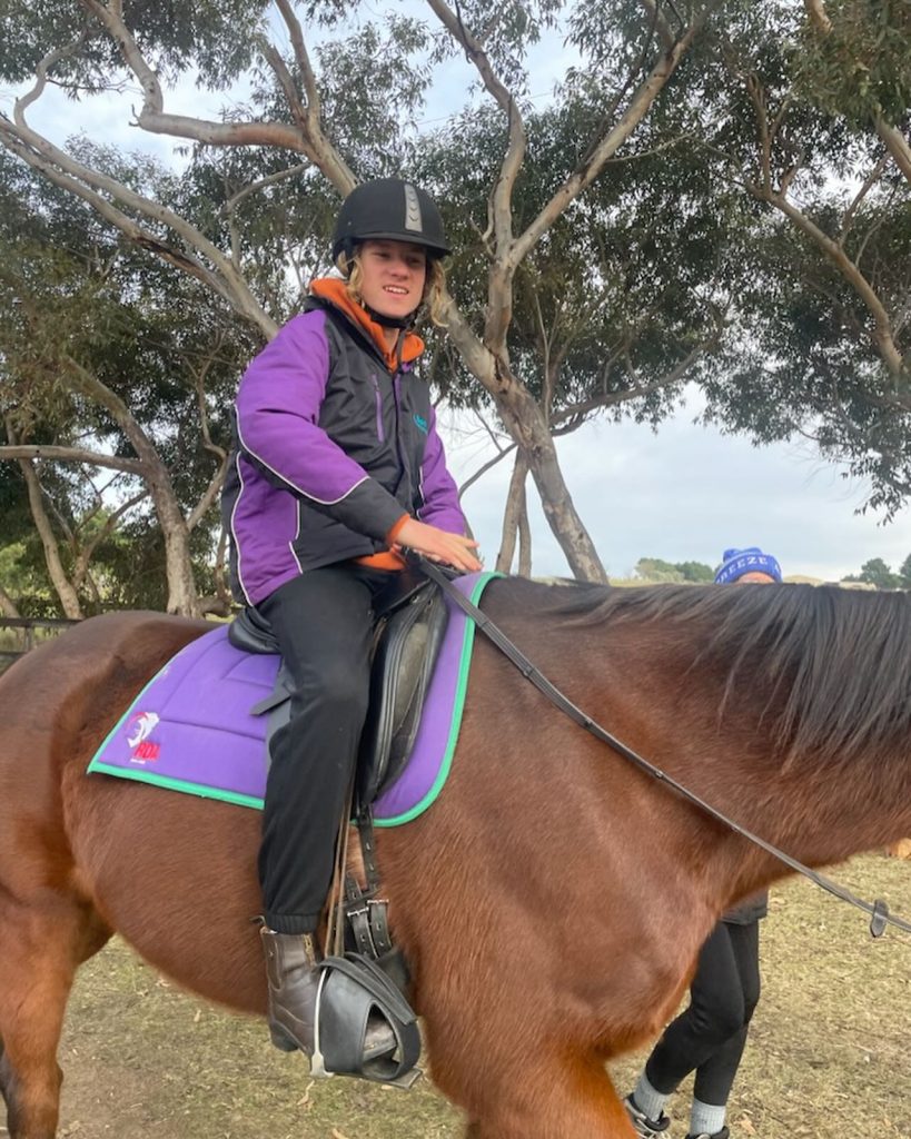 Sometimes life can become very anxious for Tom. Once on the horse the magic begins. Tom’s behaviour is more regulated, he is willing to reach out and hold a hand for a squeeze or simply touch the horses’ neck or interact with some of the activities the coach puts out. That night he sleeps well. Each week Tom grows a little more in confidence and his smile gets a little bigger.